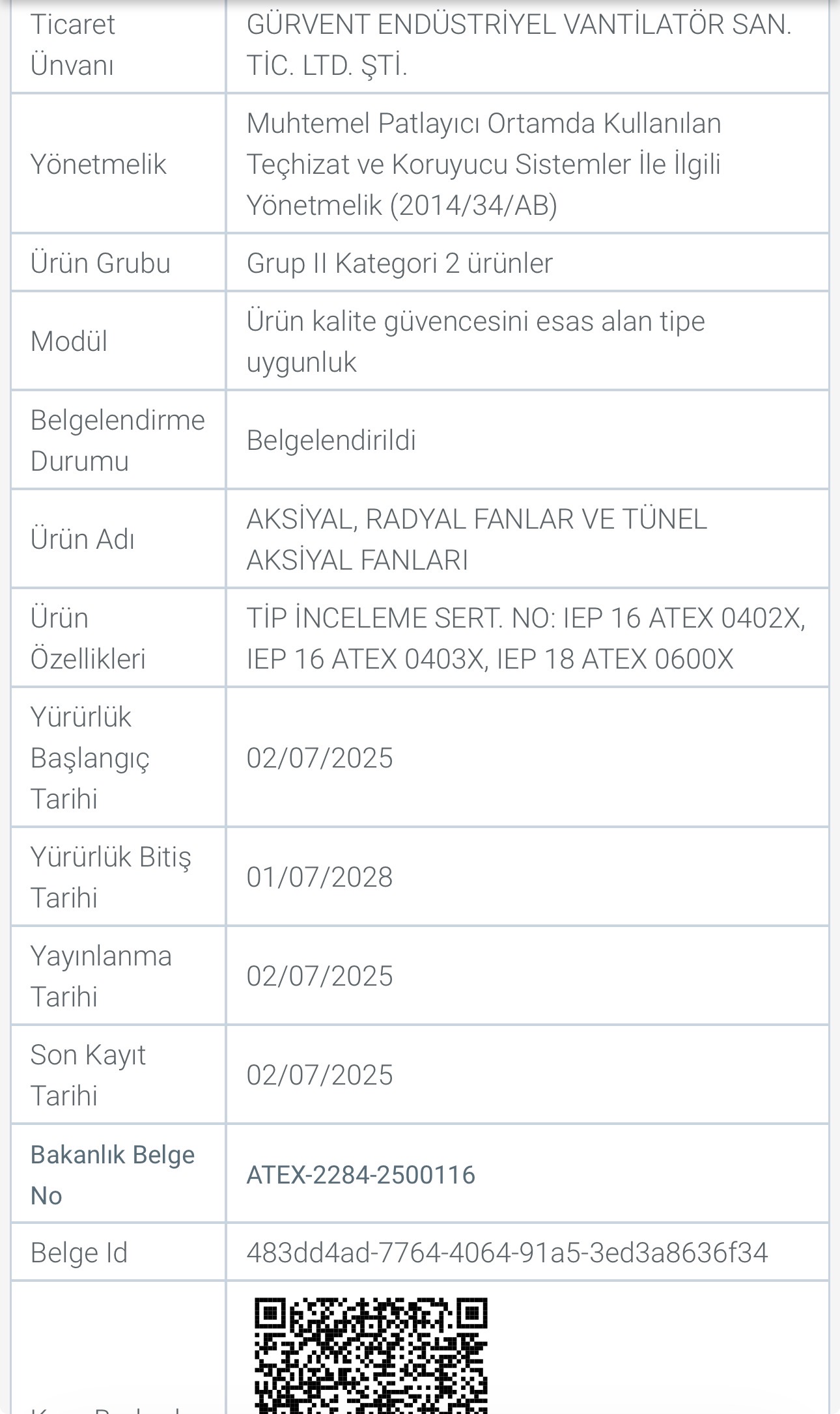 Firmamız, TÜV Rheinland onaylı ISO 9001:2015 Kalite Yönetim Sistemi ve ISO/IEC 80079-34 standardına uygun olarak, ATEX ekipmanların tasarım, üretim ve kontrol süreçlerini yürütmektedir. ATEX kapsamındaki fanlarımızda yalnızca tasarım ve malzeme uygunluğu değil, üretim sürecinin tamamı kalite güvencesi altındadır. Fabrikamızdan çıkan her bir fan, aşağıdaki bilgileri içeren ürüne özel sertifika ile sevk edilmektedir: